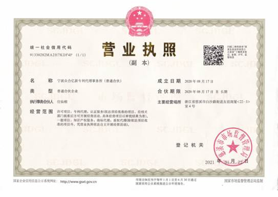 浙江億新知識產(chǎn)權服務有限公司前身為慈溪眾合知識產(chǎn)權代理事務所,創(chuàng)始于2004年,為了服務更多的創(chuàng)新企業(yè),實現(xiàn)“服務億萬創(chuàng)新企業(yè)”的理念,后更名為浙江億新知識產(chǎn)權,旗下公司包括:寧波眾合億新專利代理事務所(機構代碼33405)、中范(北京)認證有限公司。其中寧波眾合億新專利代理事務所是慈溪市科技服務聯(lián)盟理事單位,前灣區(qū)知識產(chǎn)權工作站。公司位于浙江省慈溪市文化商務區(qū)友誼商廈,并在北京、青島設有辦事處。